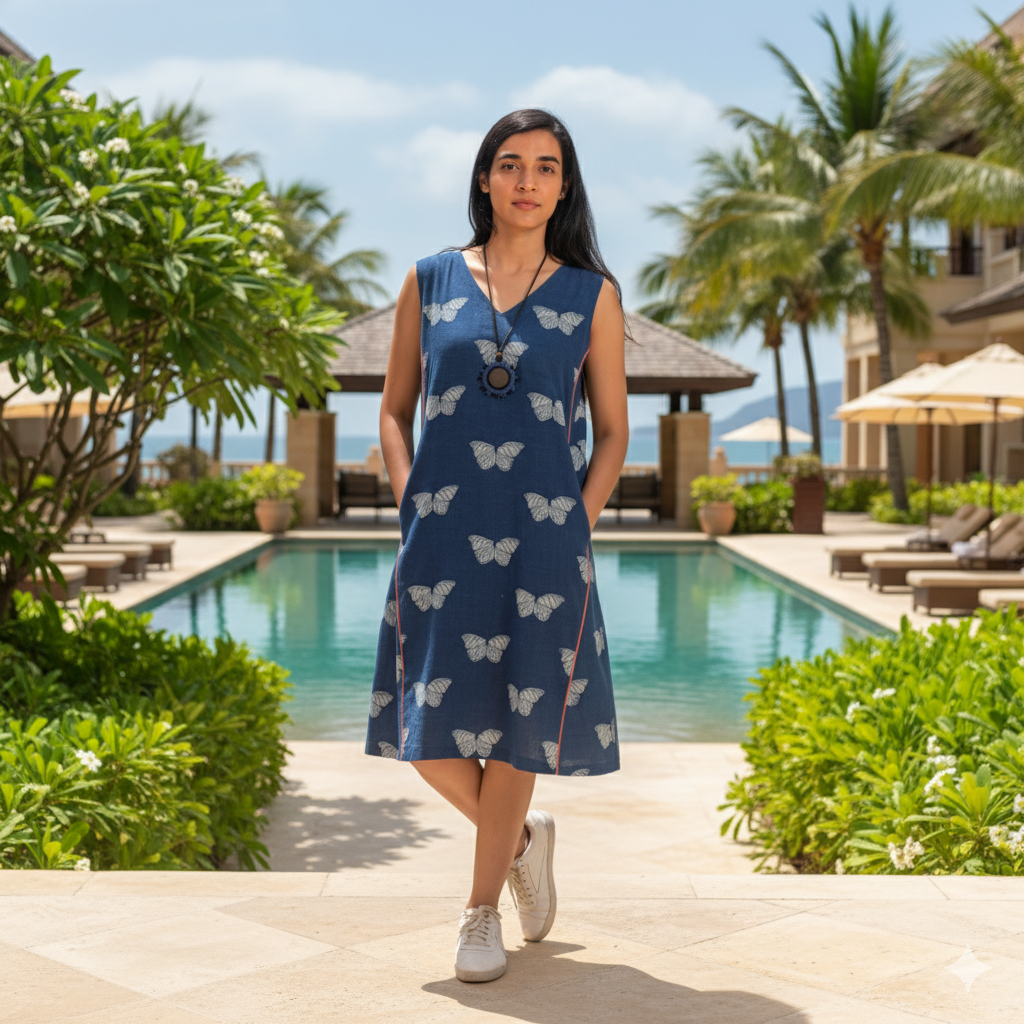 The Sleeveless V-Neck Indigo Dress features an A-line silhouette with contrast color piping along the hidden pockets. Cool and versatile, this dress transitions seamlessly for any outing or occasion.