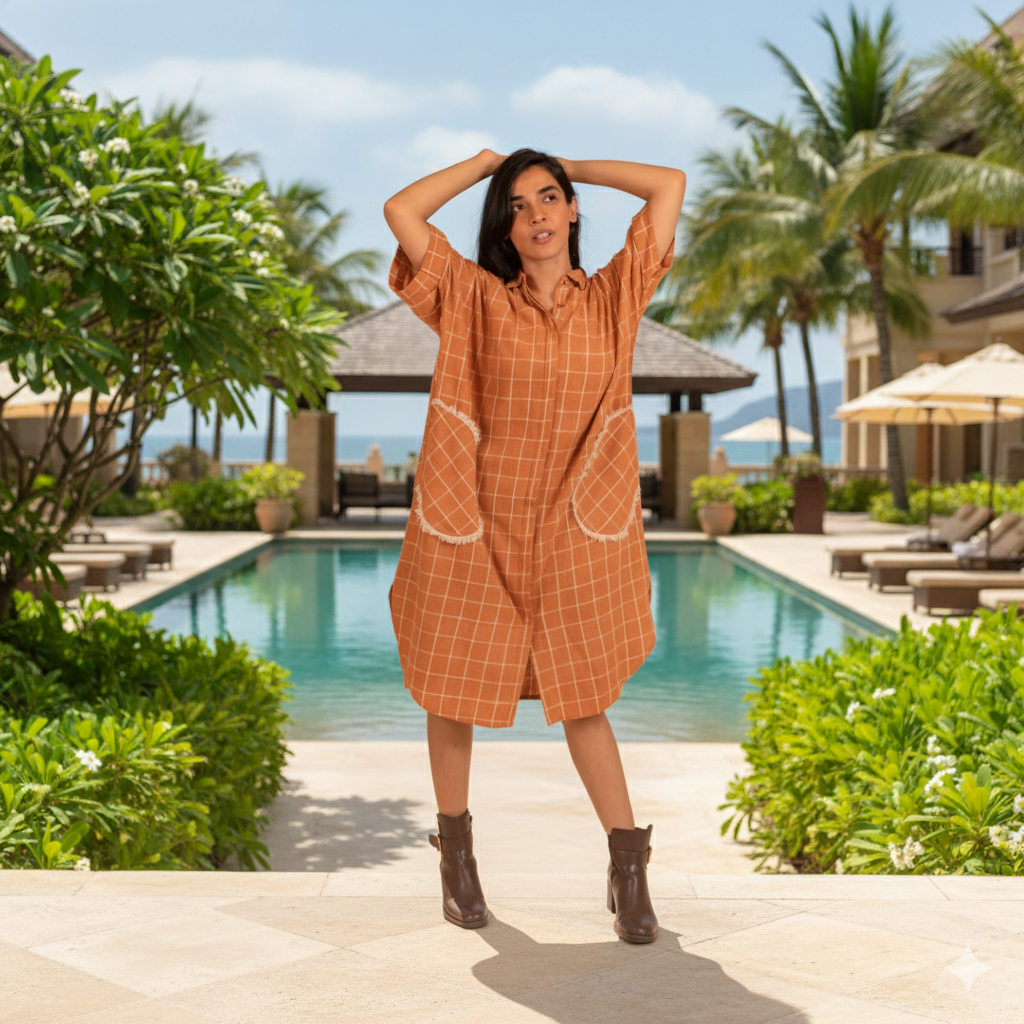 The Beach Dress is a frayed trim, patch pocket shirt dress with an apple-shaped hem and relaxed-fit sleeves. This breezy shirt dress can be styled with cigarette pants or worn as an overshirt.