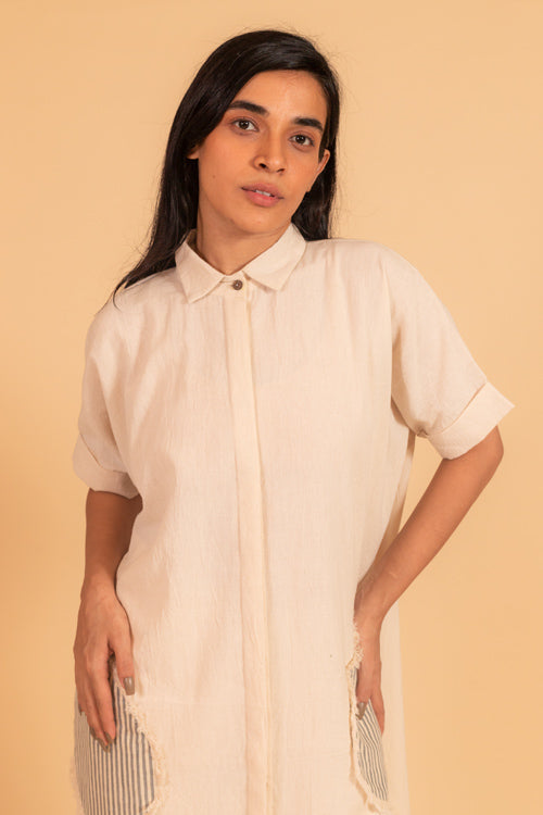 MORALFIBRE Beach Dress from Shapes Collection features frayed trim patch pockets in grey stripes , Apple Shape Hem & Relaxed Fit Sleeves. The easy breezy shirt dress can be worn with cigratte pants or as an over shirt