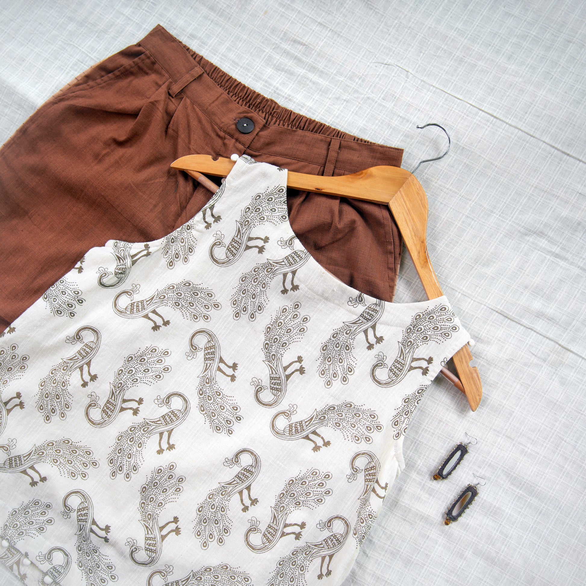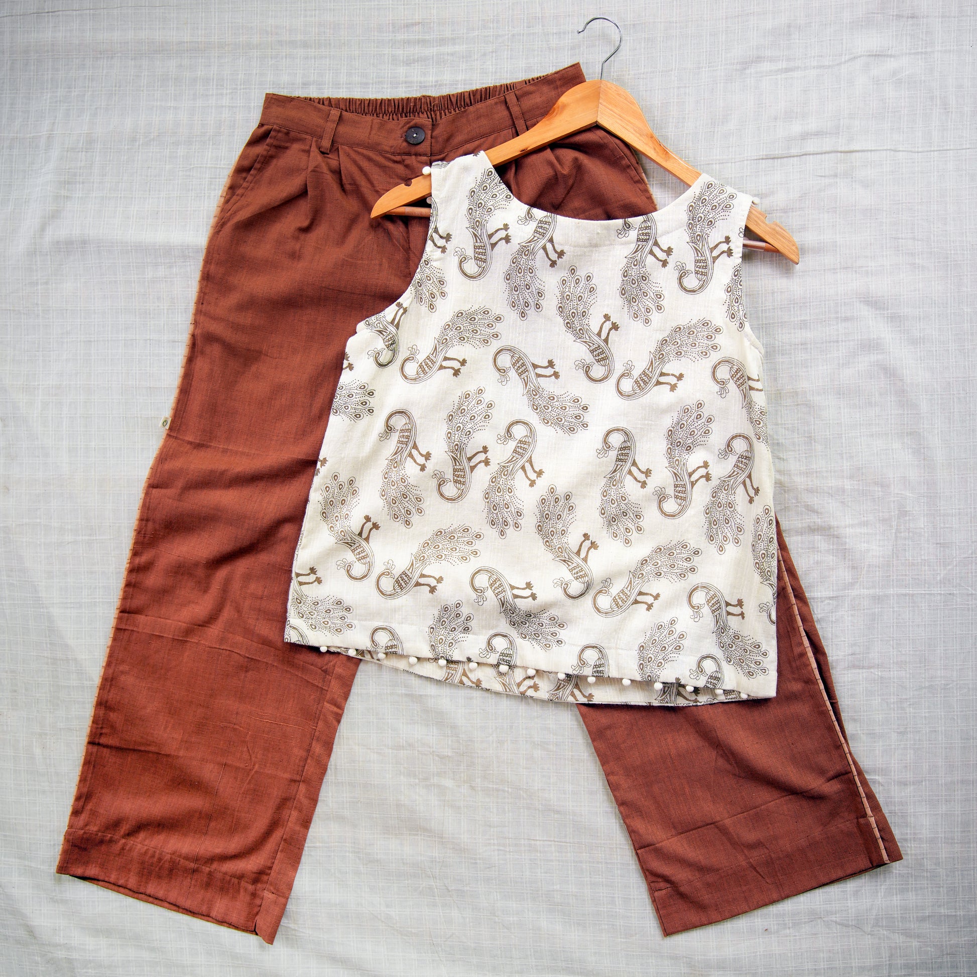 This rich peacock-print, sleeveless top pairs seamlessly with high-waisted earthy rust pants. A bold yet breathable outfit made for gifting, festive catch-ups, or easy office days.