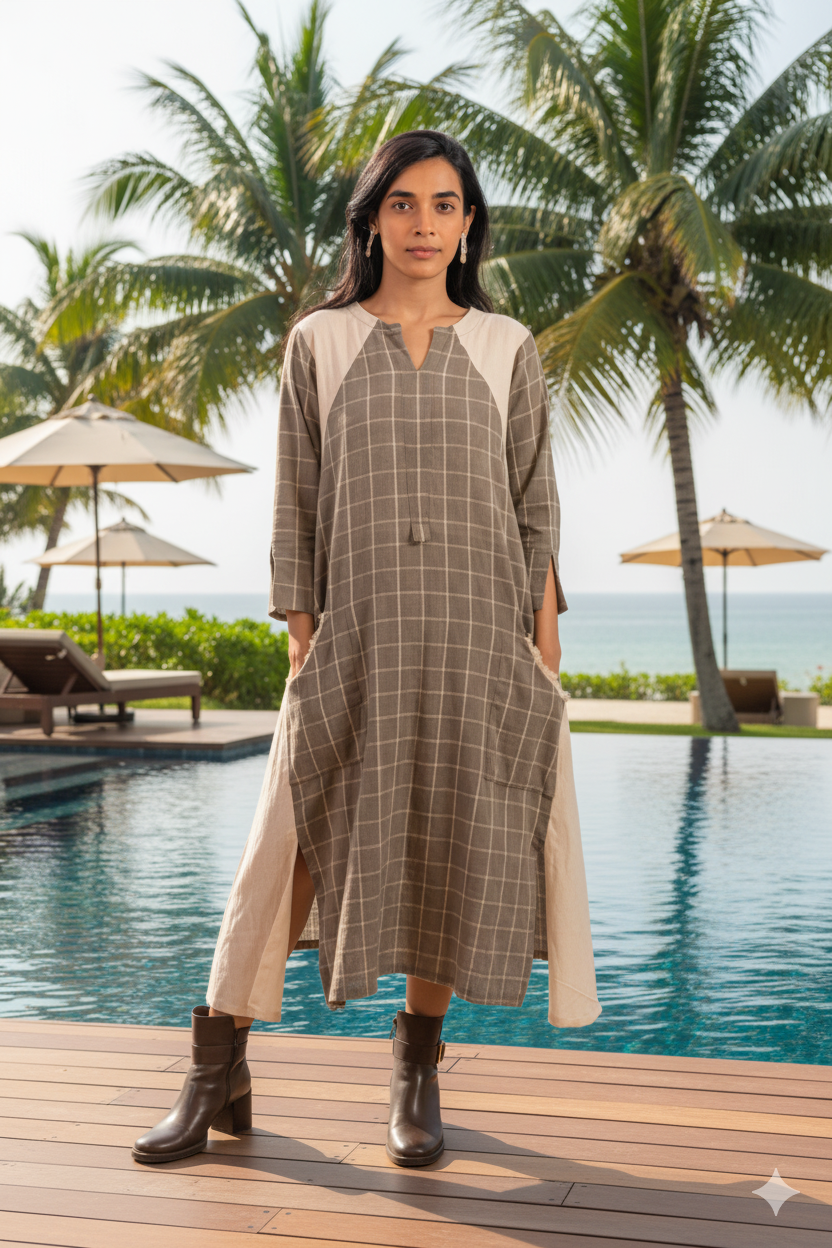 The Dress features side kali detailing from the waist, giving it a tapered look. Frayed trim patch pockets and front slits provide easy movement, making it perfect to wear as a dress or paired with cigarette pants.